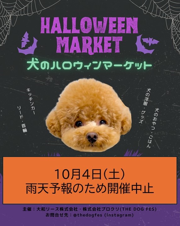 本日(10月4日(土))開催を予定していました『THE DOG FES-犬のハロウィンマーケット-』は、雨天予報のため中止とさせていただきます。