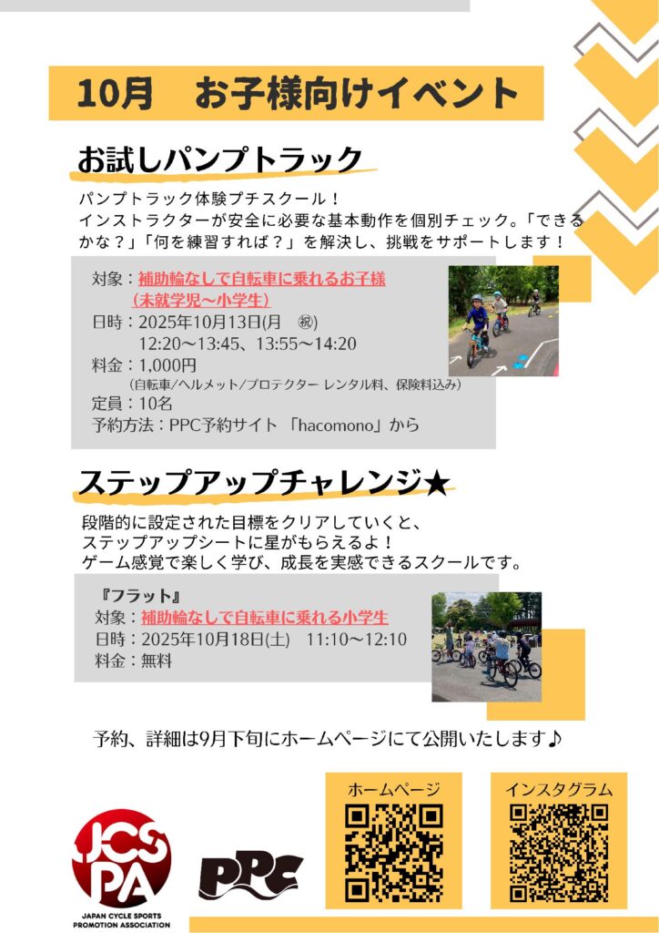 日にち: 10月13日㈪㈷ 時 間: 12:20~13:45・13:55~14:20対 象: 補助輪なしで自転車に乗れ …
