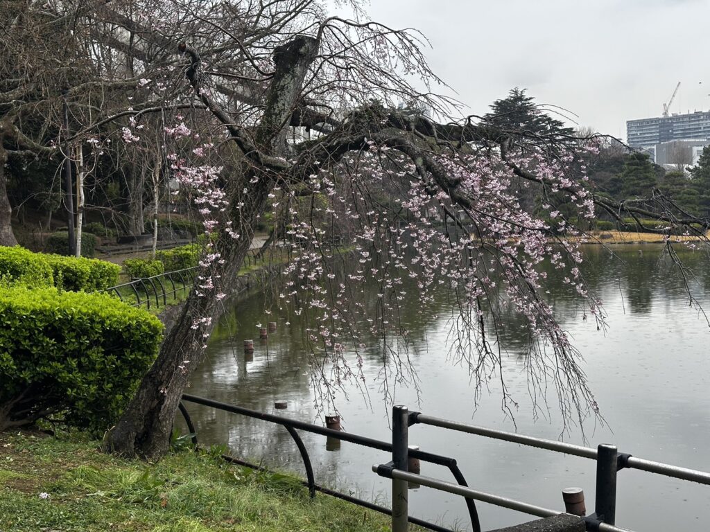 池周辺のシダレザクラがどんどん開花してきています -