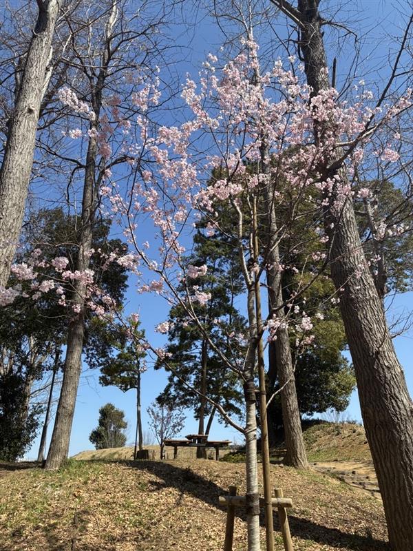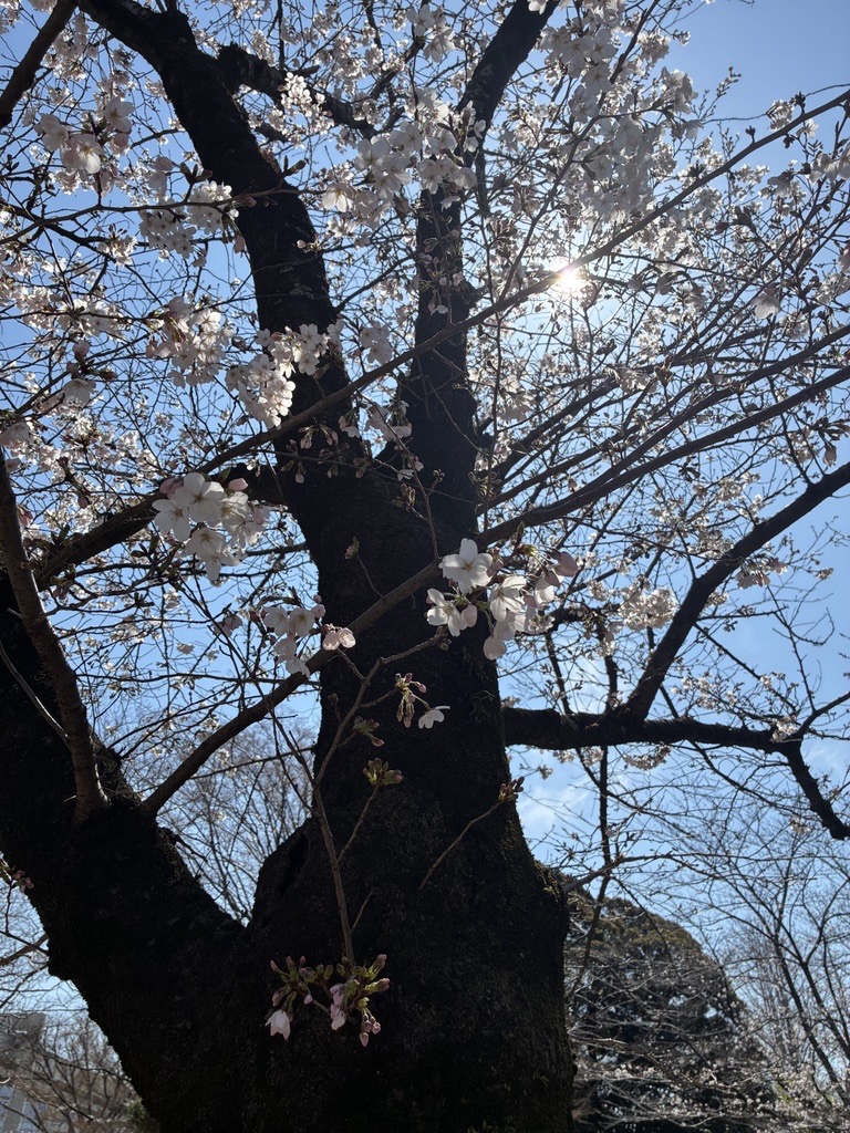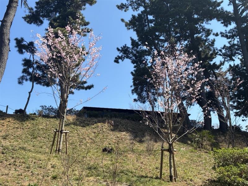 壁画がある白いフェンス沿いの道には「神代曙(ジンダイアケボノ)」という桜が見ごろになっています。