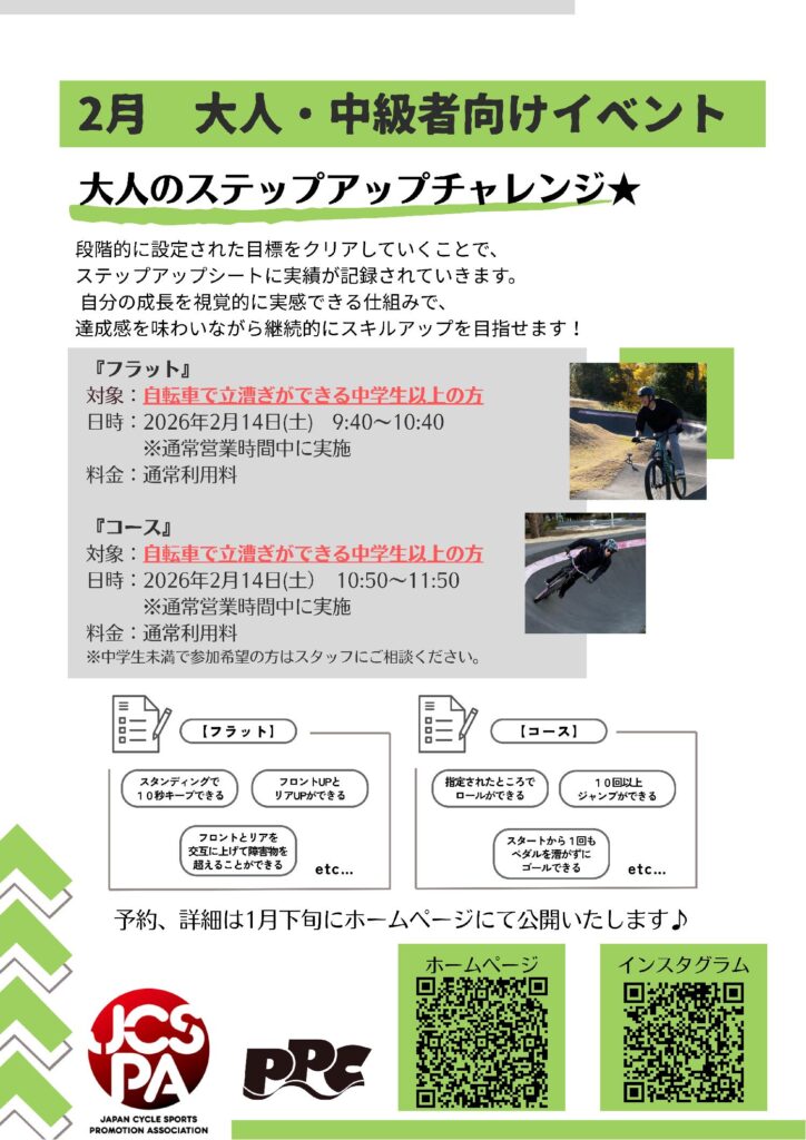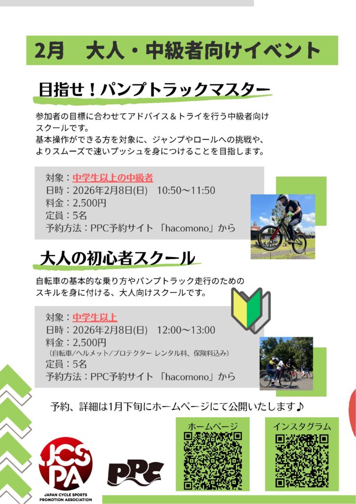 日にち: 2月8日㈰【目指せ!パンプトラックマスター】時 間:10:50~11:50対 象:中学生以上の中級者【大人の …