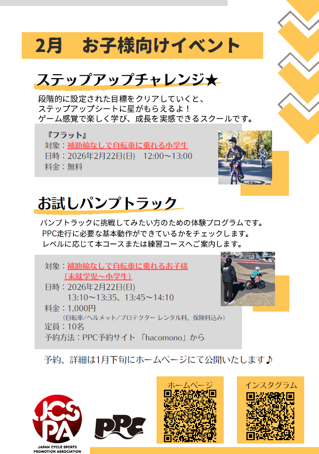 日にち: 2月22日㈰【ステップアップチャレンジ★】時 間:12:00~13:00対 象:補助輪なしで自転車に乗れる小 …