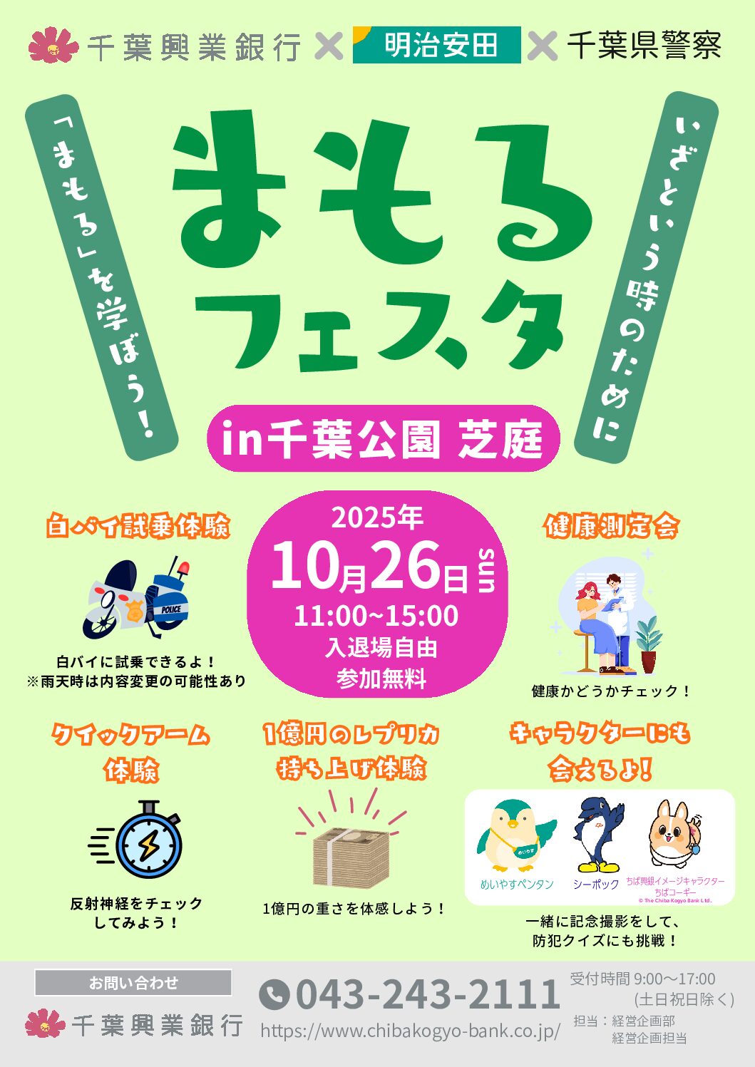 「まもる」をテーマとして、千葉興業銀行、明治安田生命保険相互会社、千葉県警察が協働で千葉公園芝庭にて体験型イベントを実施いたします。