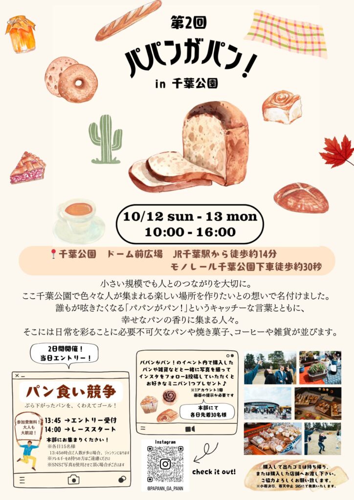 日にち:10月12日(日)・13日(月・祝)時 間:10:00~16:00場 所:千葉公園 TIP STAR DOME前広場料 金:入場無料おいしいパンや焼き菓子、ステキな雑貨を販売♪当日エントリーのパン食い競争は2日間開催!参加無料&大人も大歓迎です!幸せなパンの... -